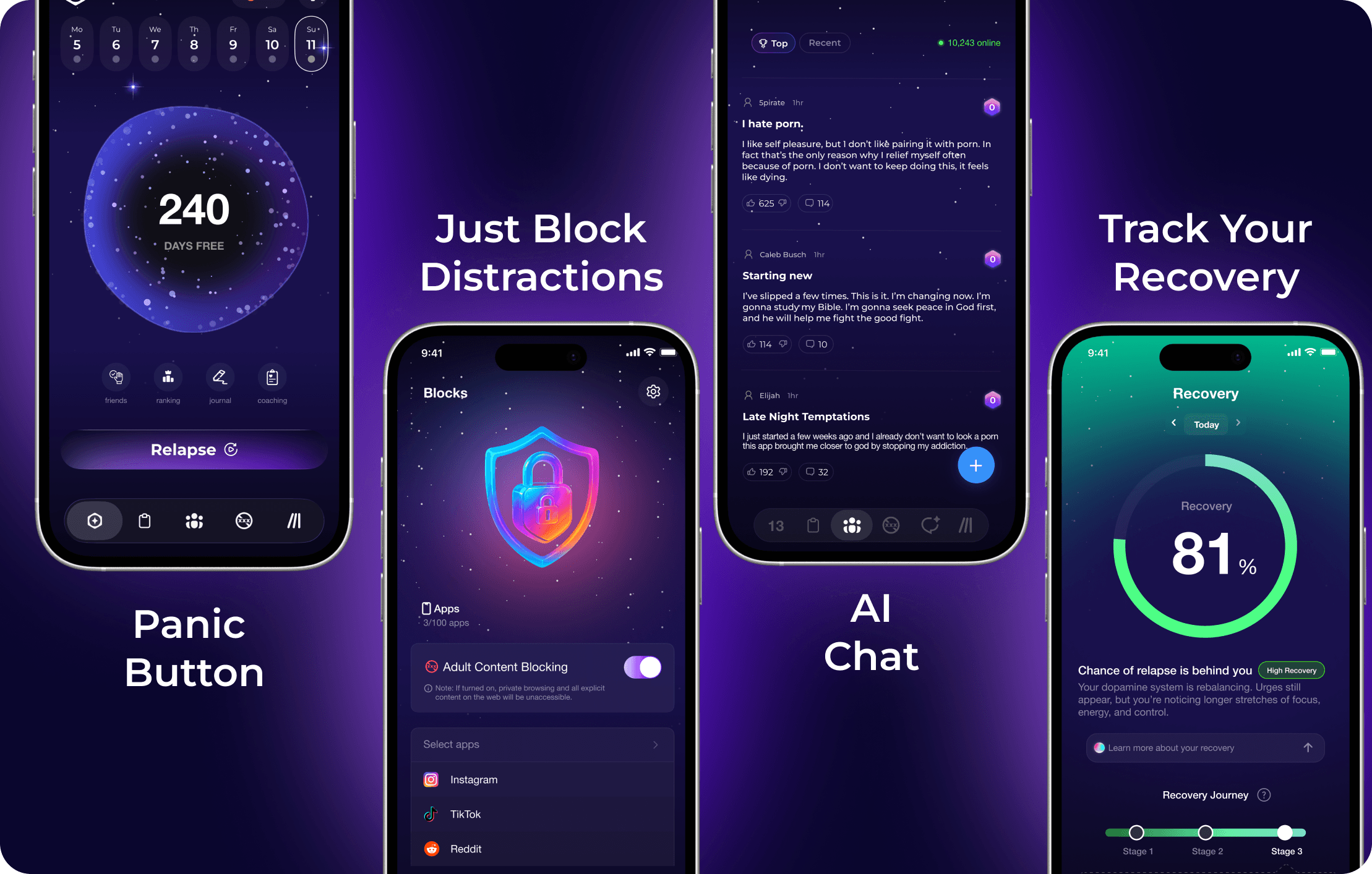 An efficient, real-time panic button quickly extinguishes urges, helping you regain control in moments of weakness.